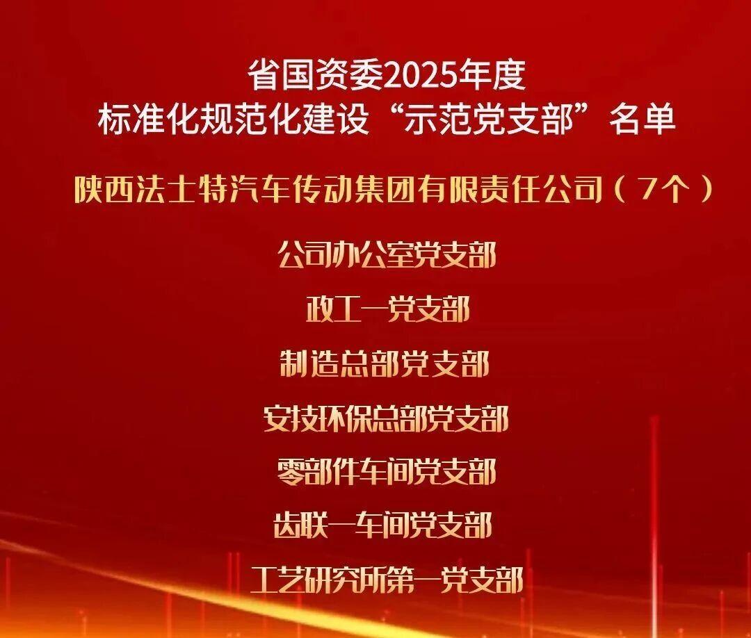 點擊量:1815近日,陜西省國資委黨委通報2025年度標準化規范化建設示范黨支部名單,法士特集團公司辦公室、政工一、制造總部等7個基層黨支部榜上有名,榮獲省國資委“示范黨支部”稱號。這既是對法士特集團黨委深耕黨建品牌建設、推進基層黨組織標準化規范化建設成果的高度肯定,更彰顯了企業以制度落實強化組織效能、推進黨建與業務深度...